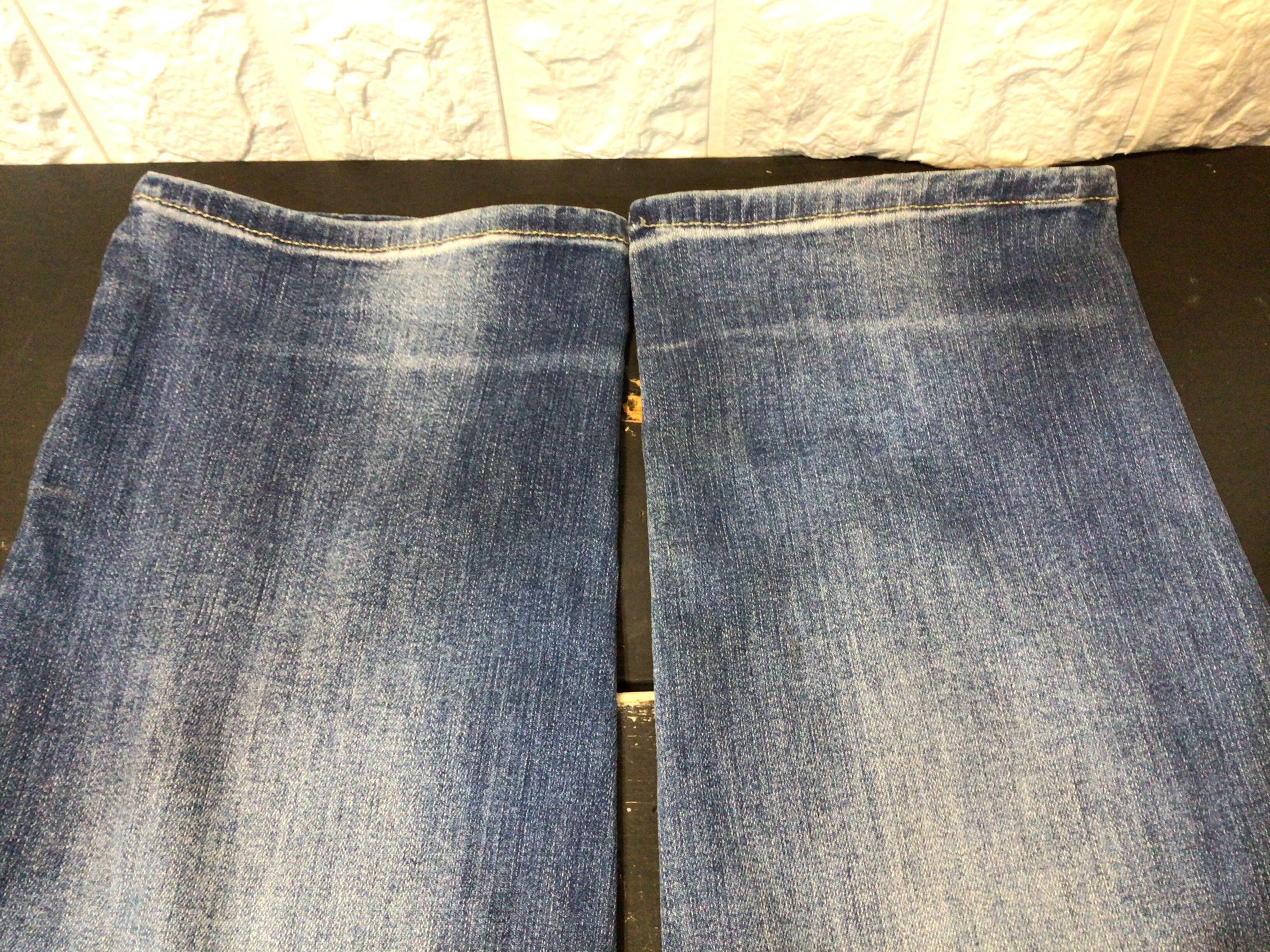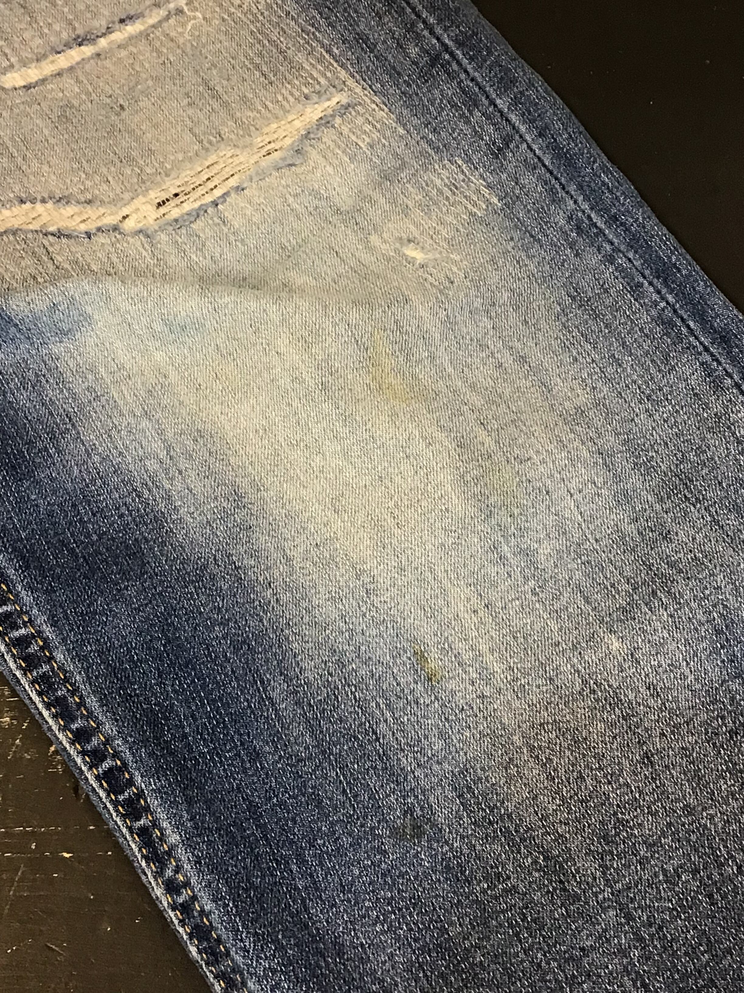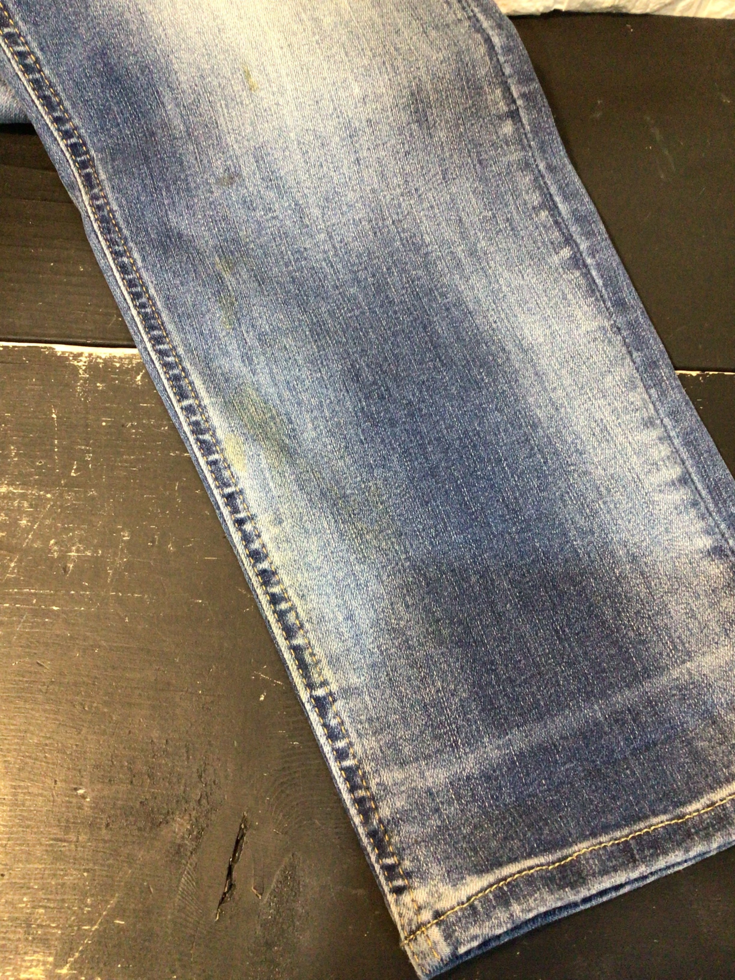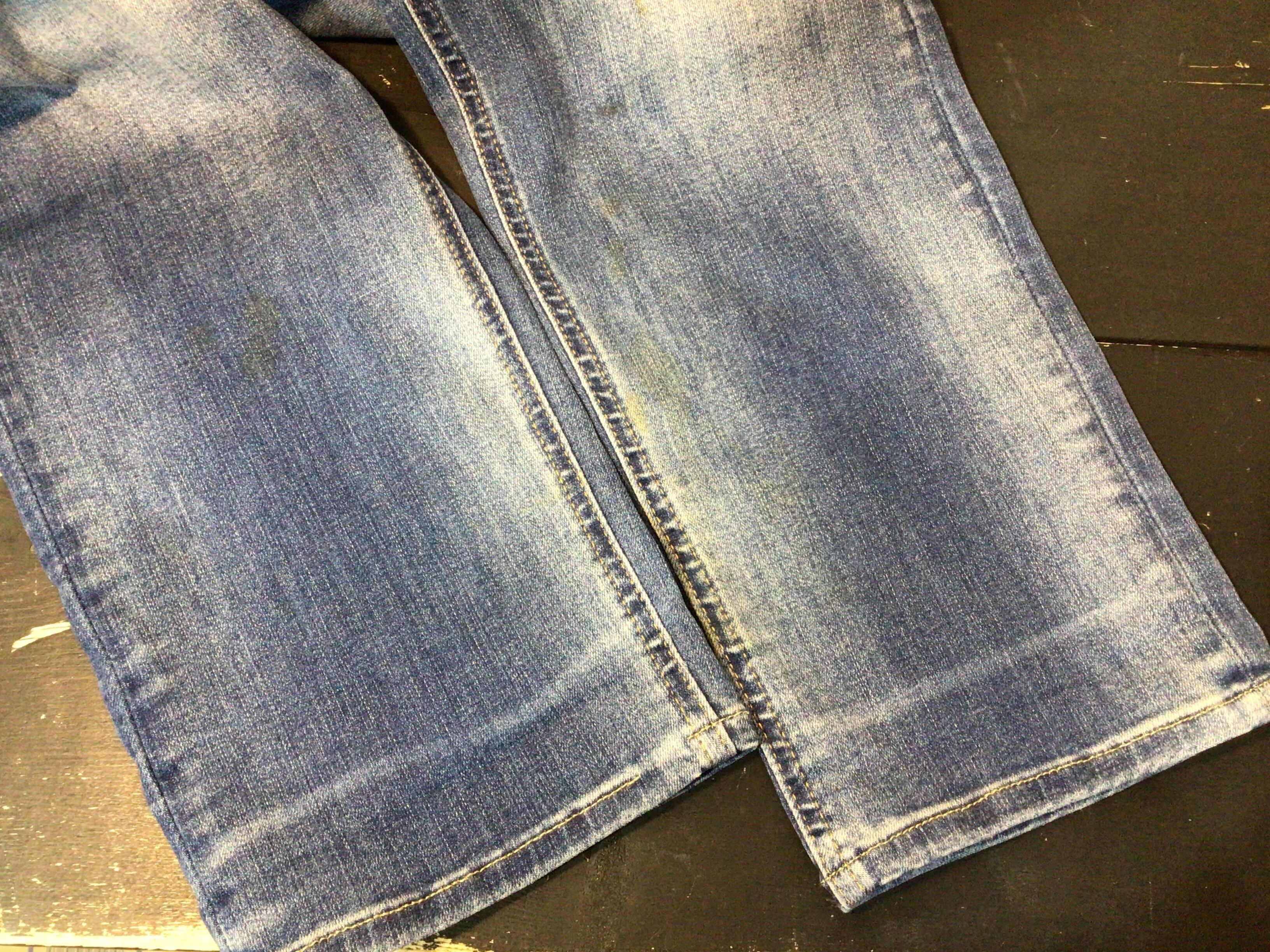 左膝辺りから裾部分にかけてと、右膝下や後ろ側に汚れシミがあります。