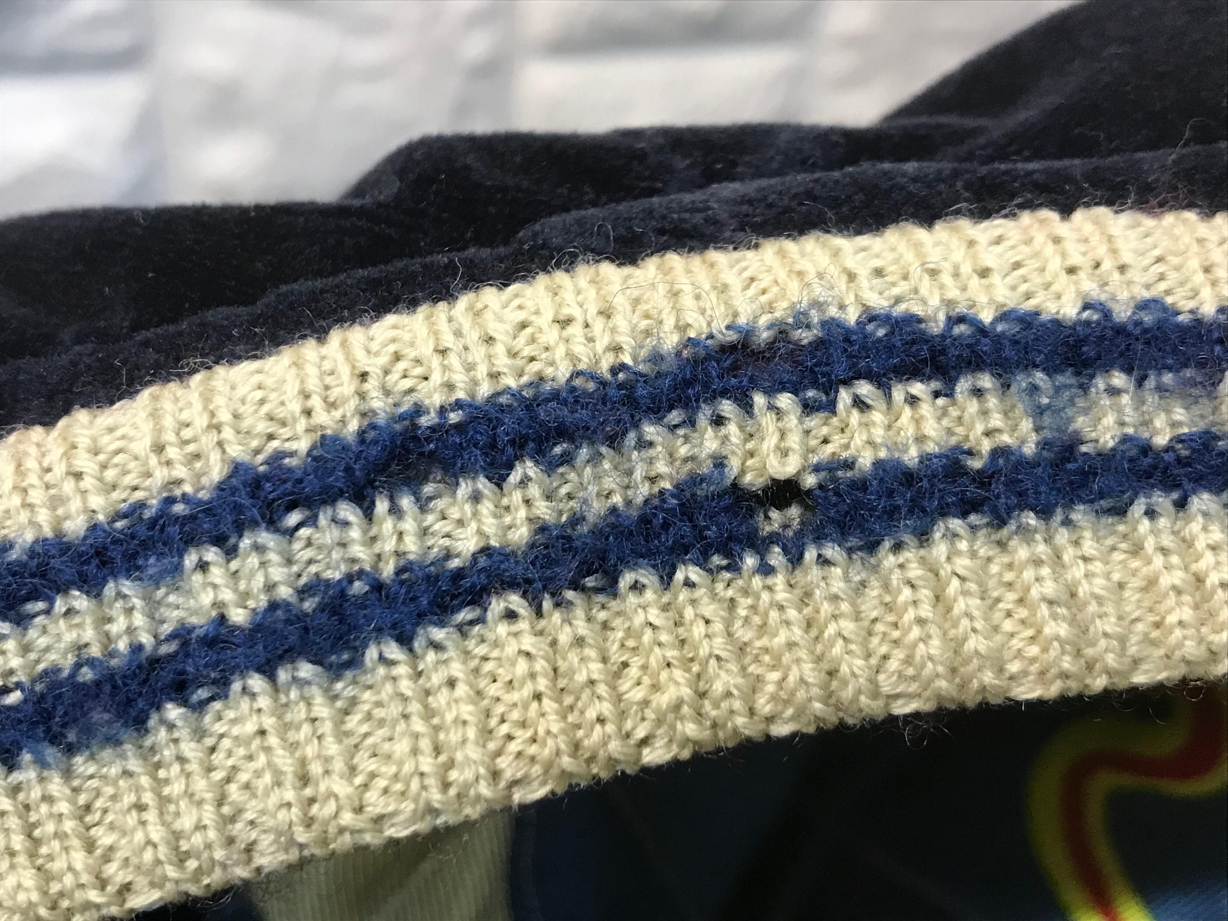 襟周り、裾などのリブ編み部分に数カ所小さめの穴があります。