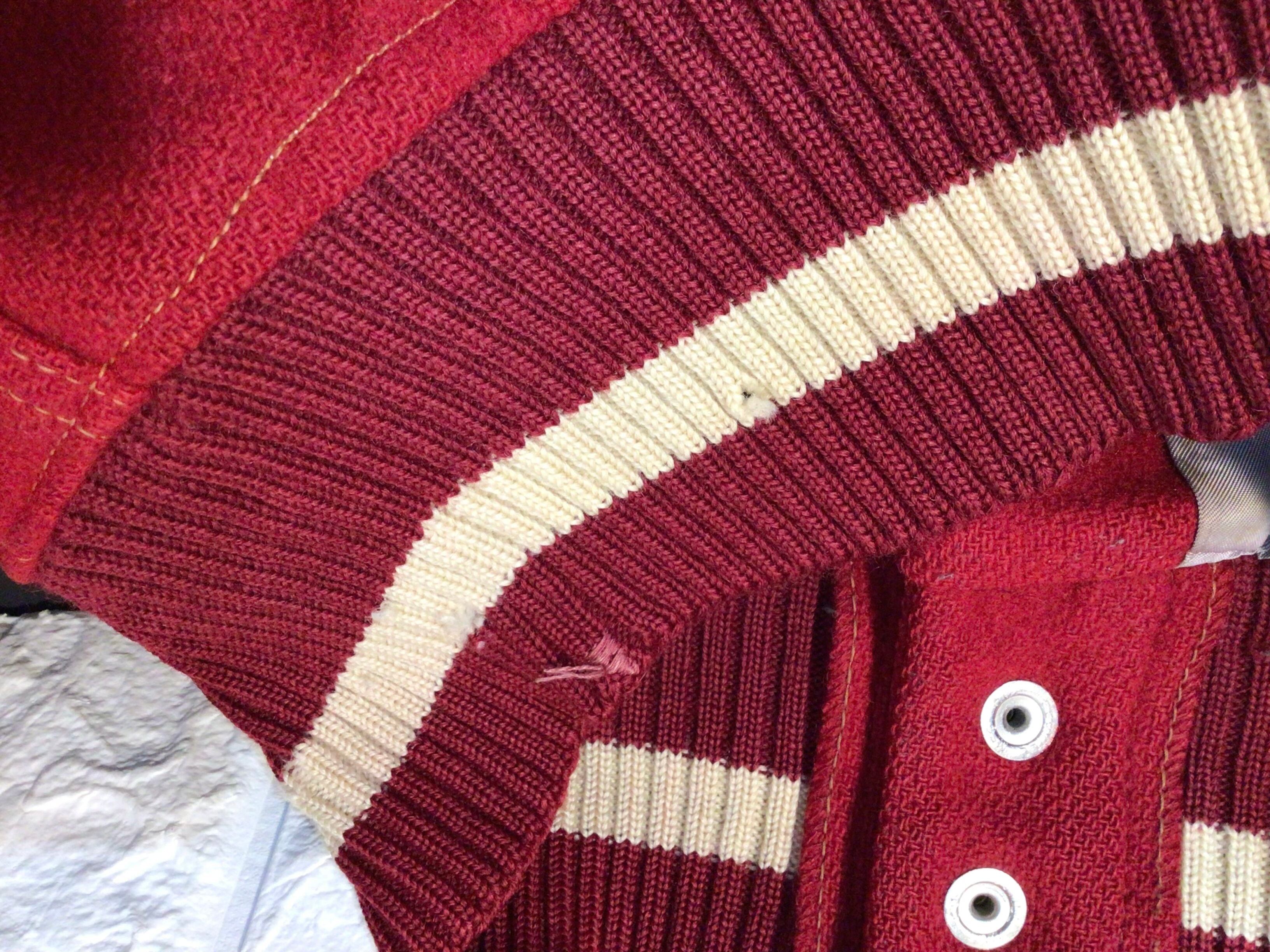 全体的に使用感大で、襟周り、裾、袖口などリブ部分にたくさんの穴があります。