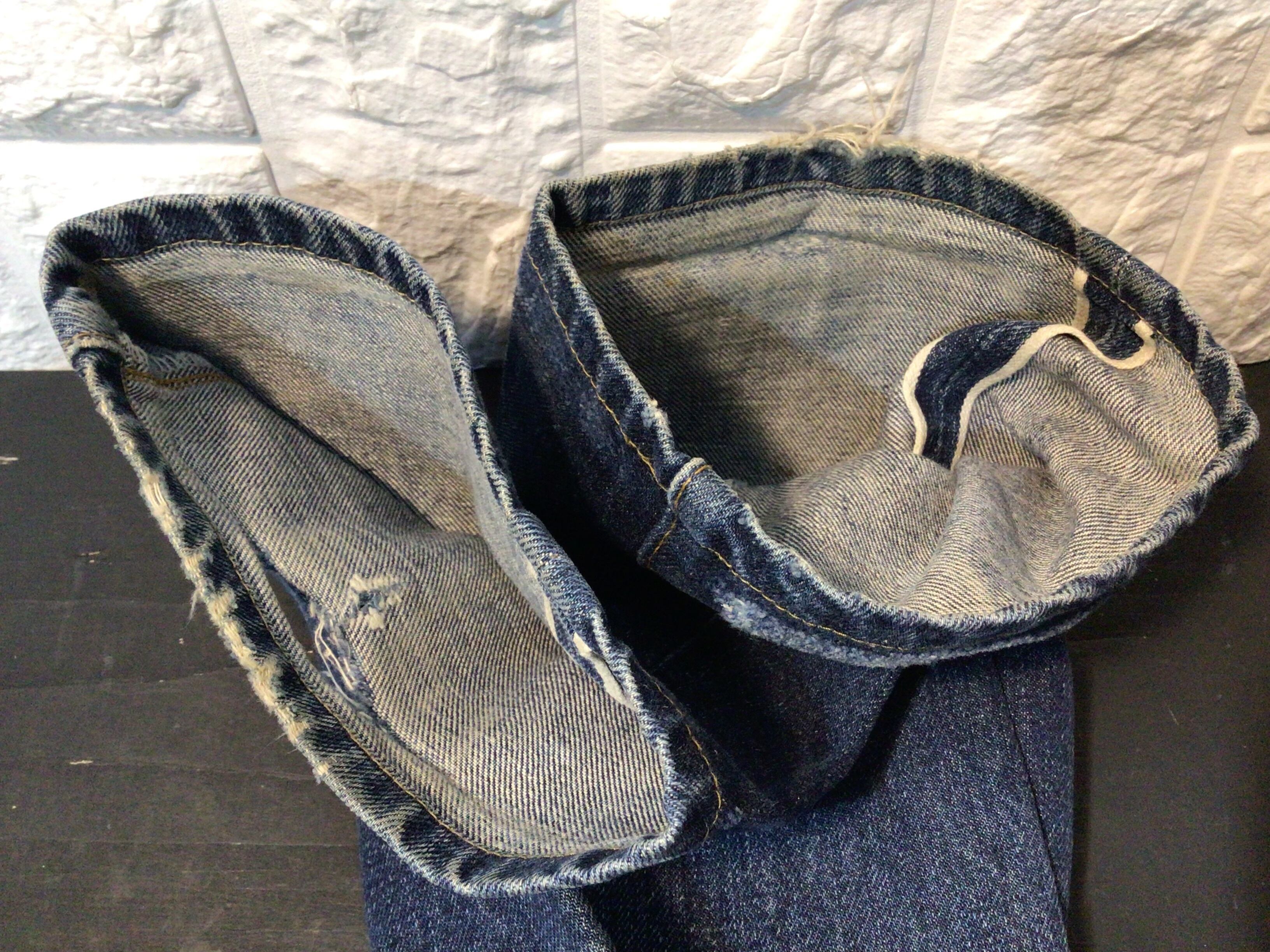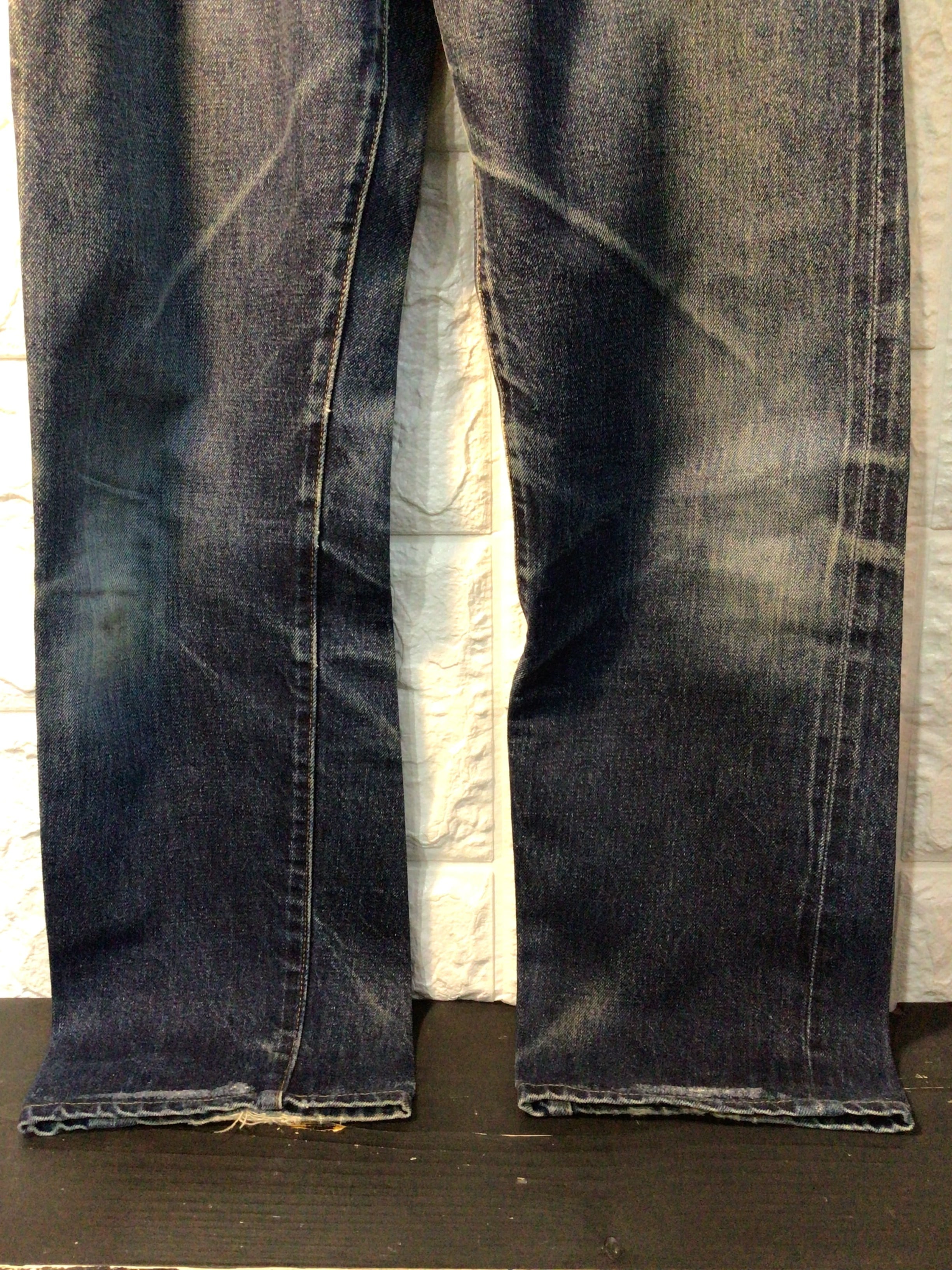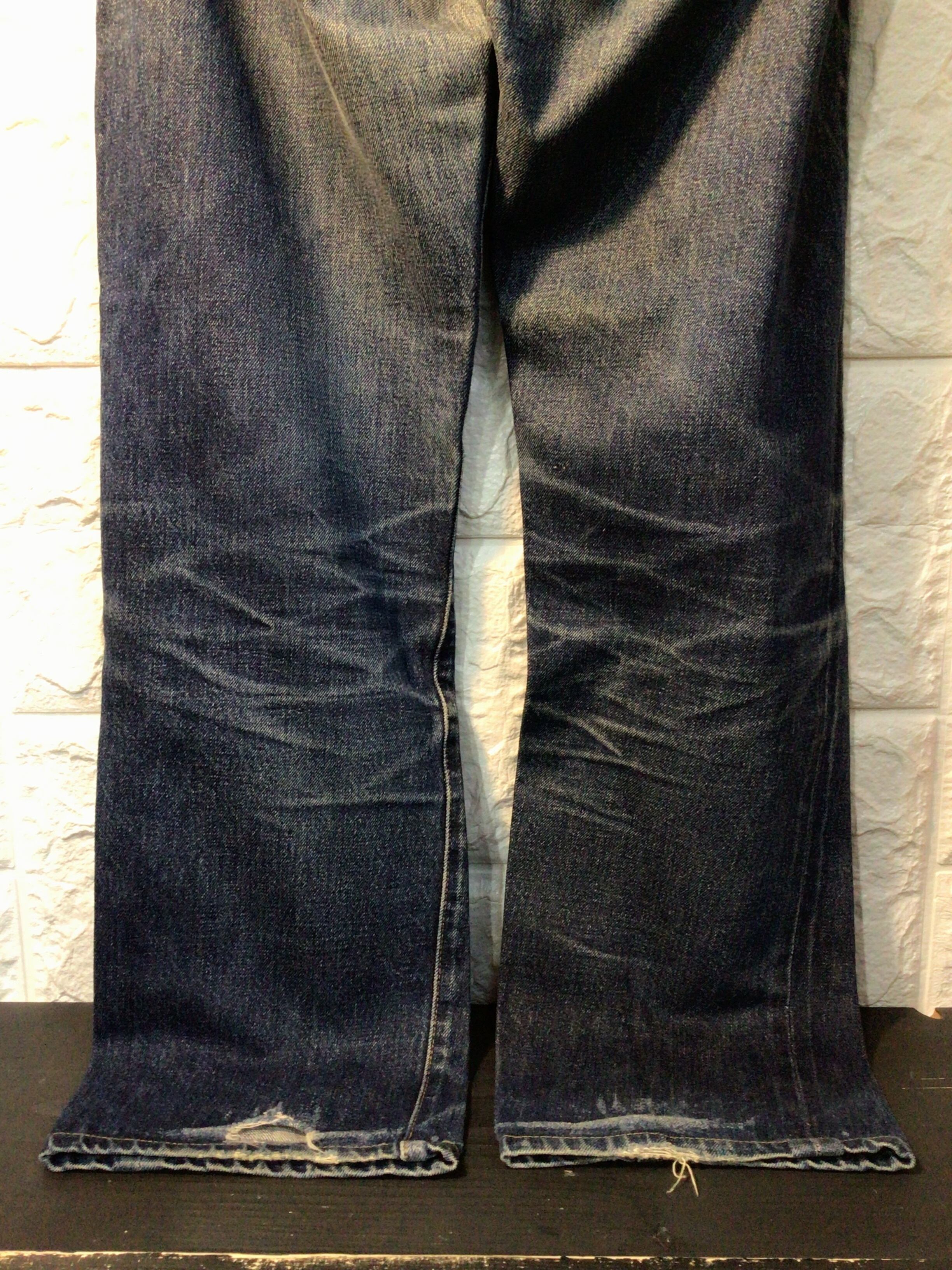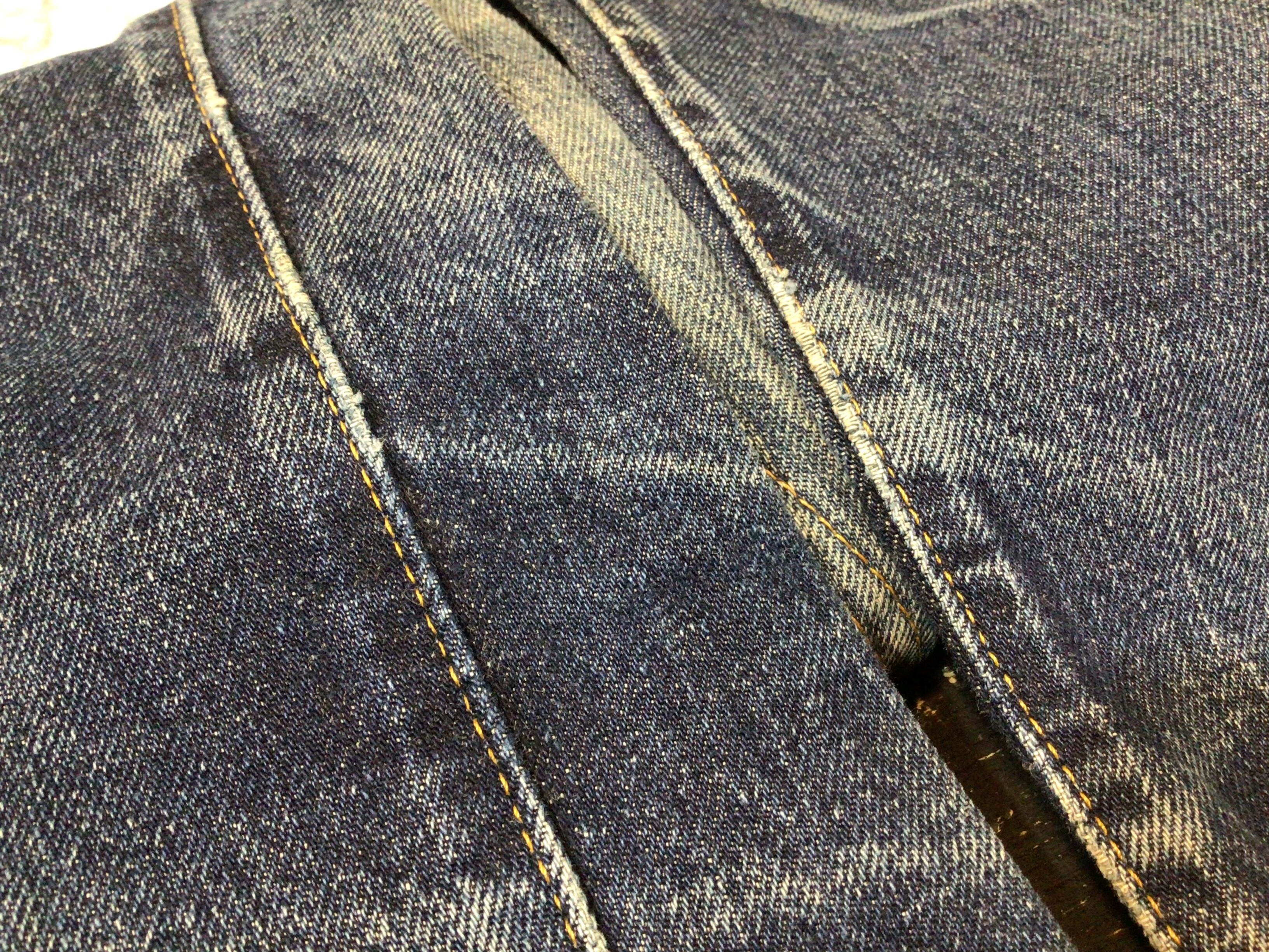 左後ろポケット周辺、股下部分、裾部分に使用感のある生地のスレや破れなどあります。