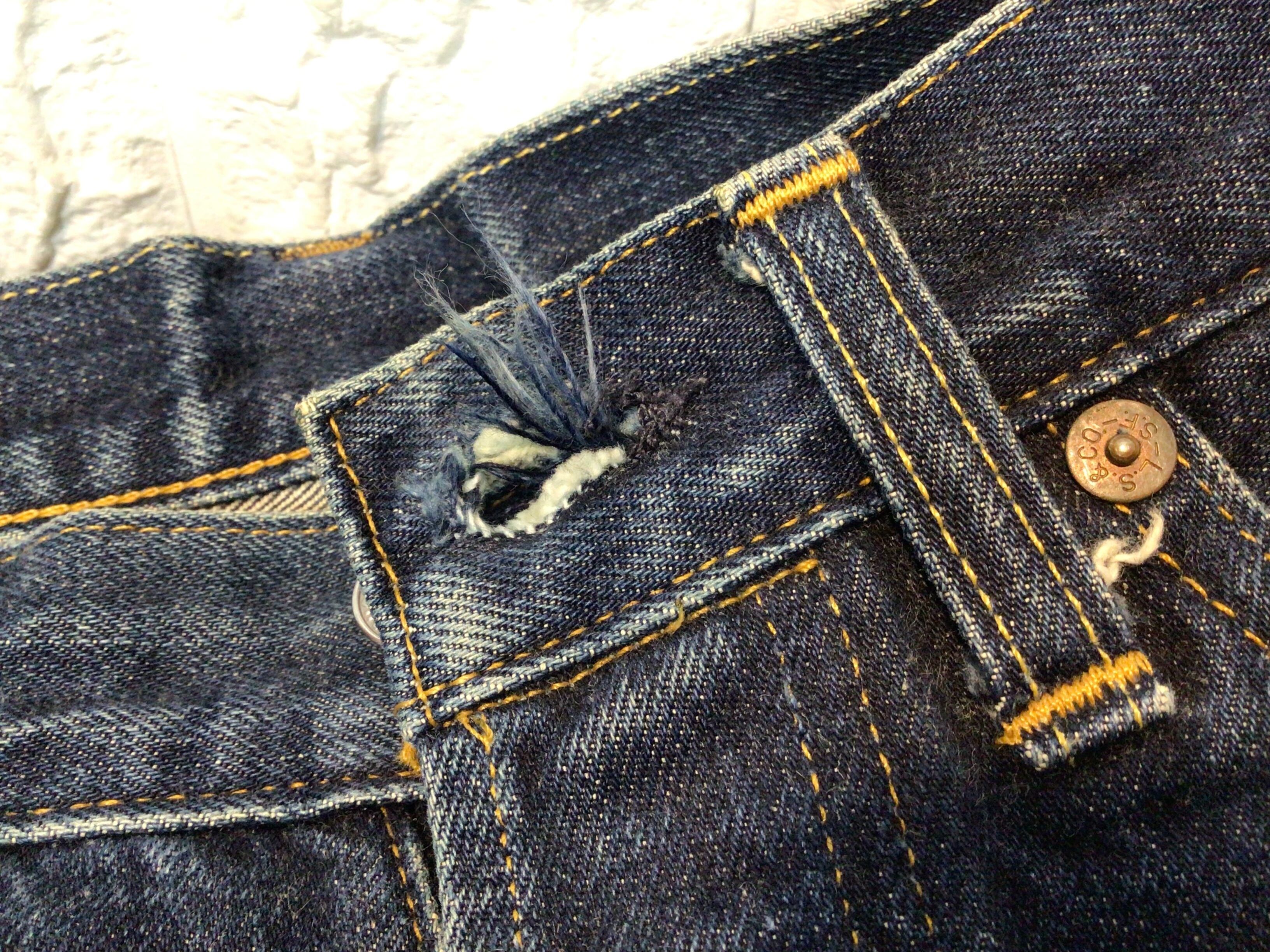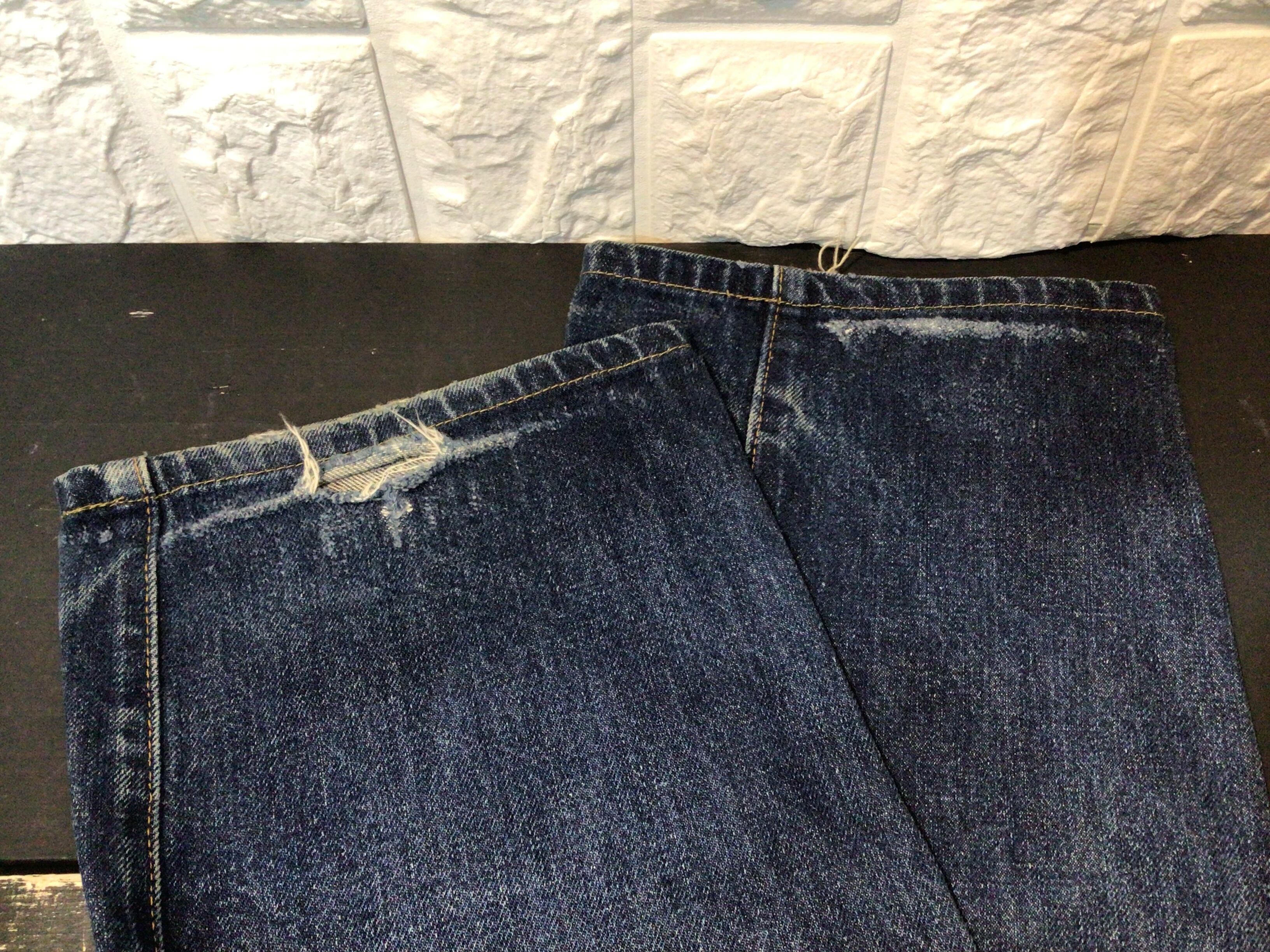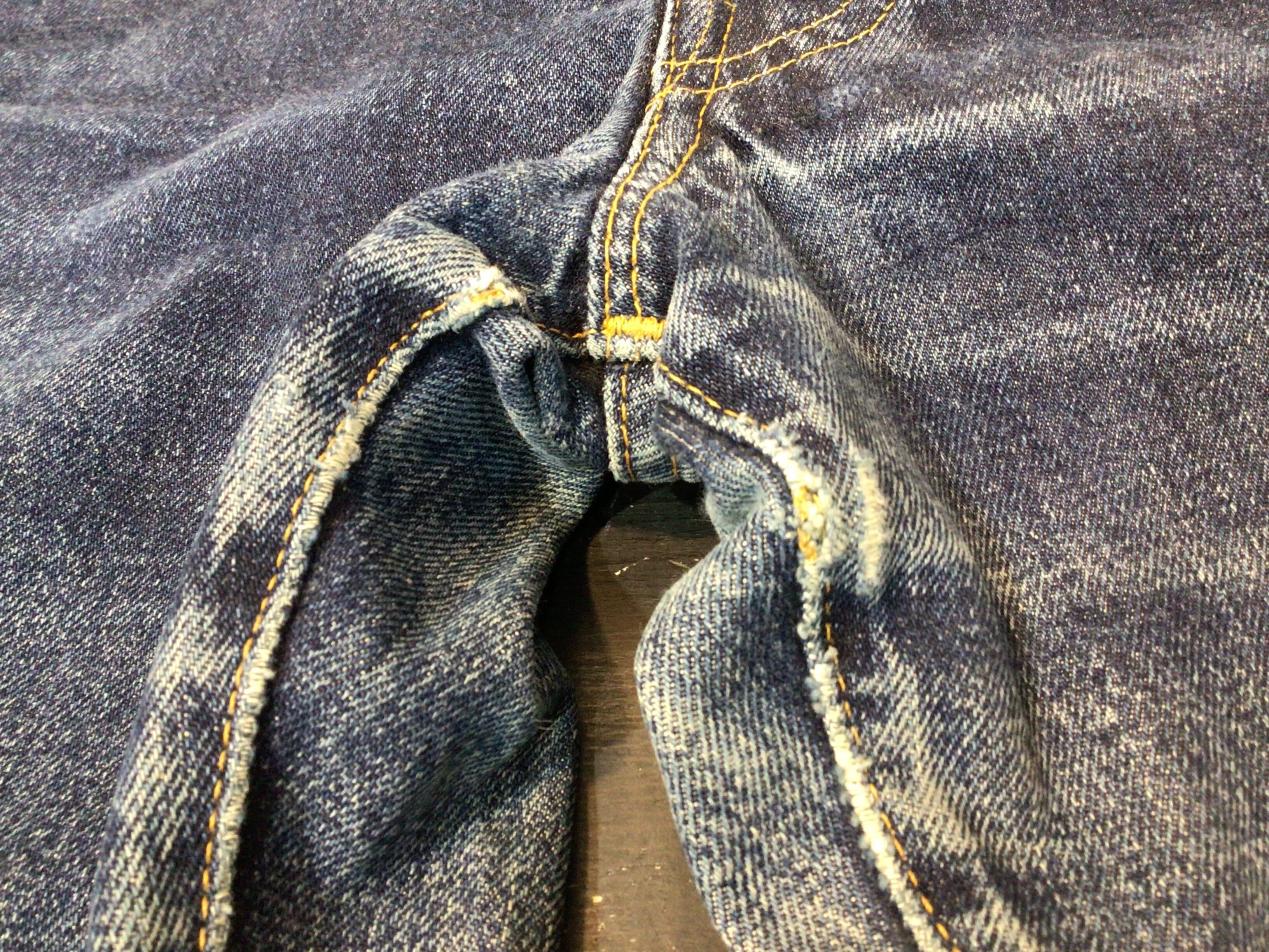 左後ろポケット周辺、股下部分、裾部分に使用感のある生地のスレや破れなどあります。