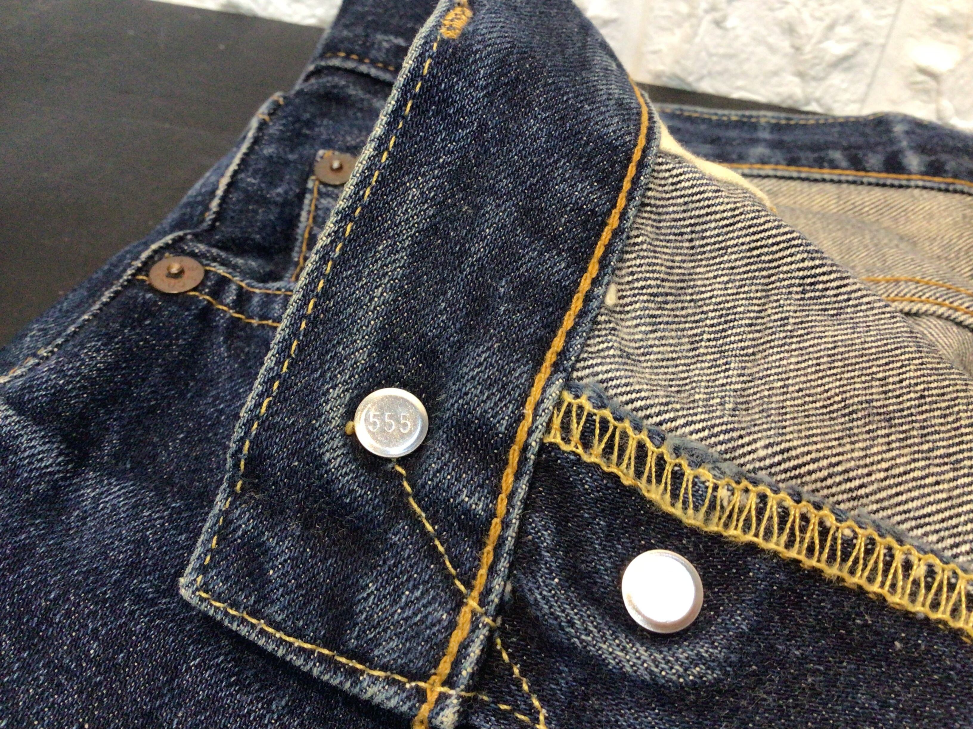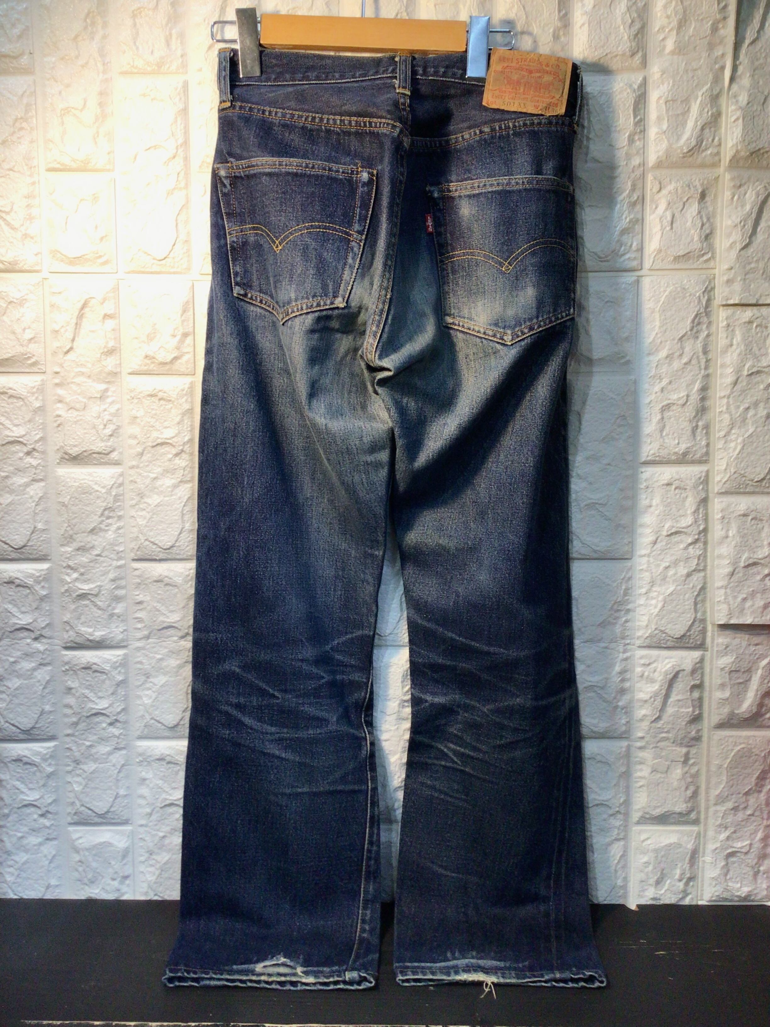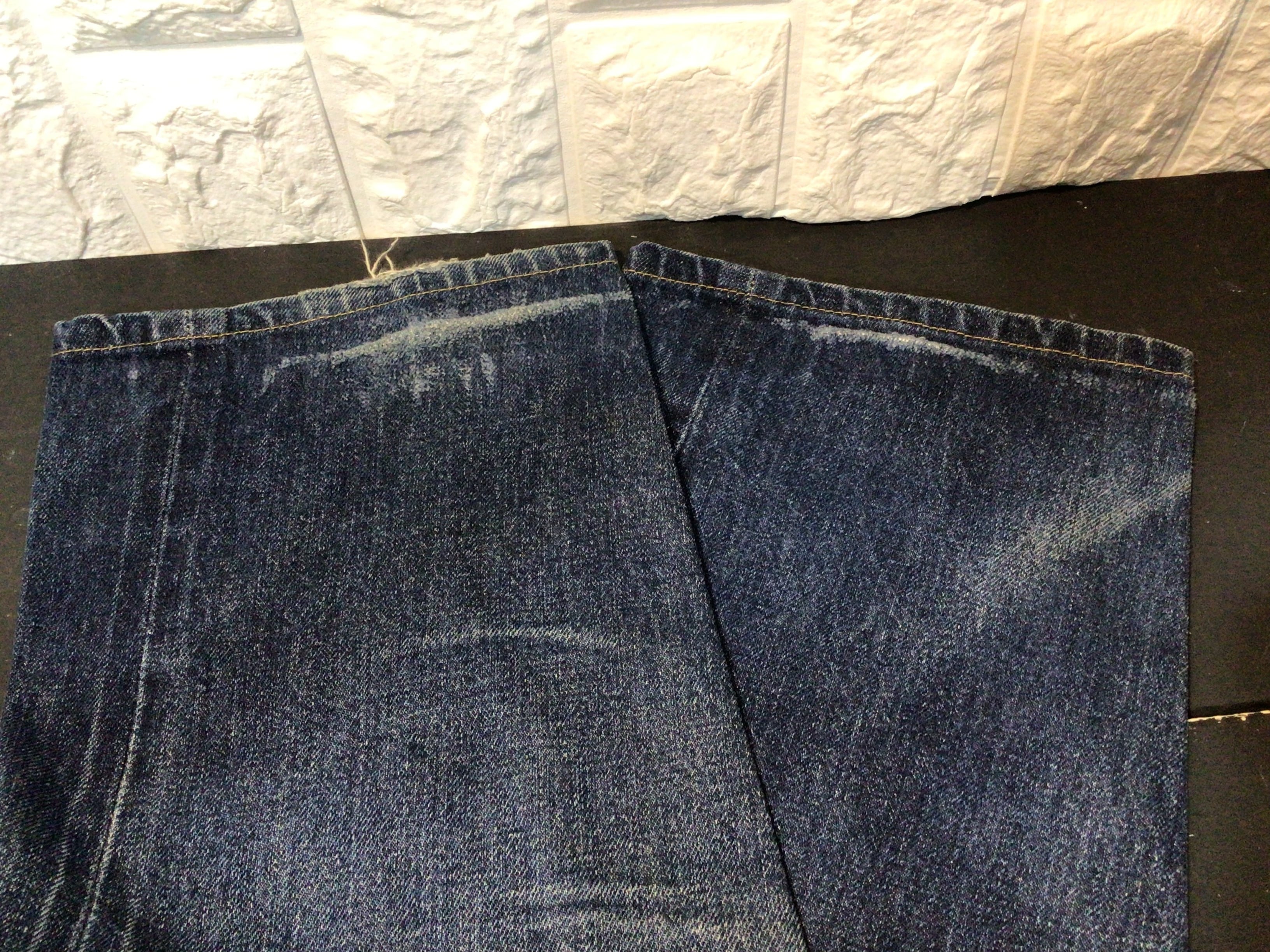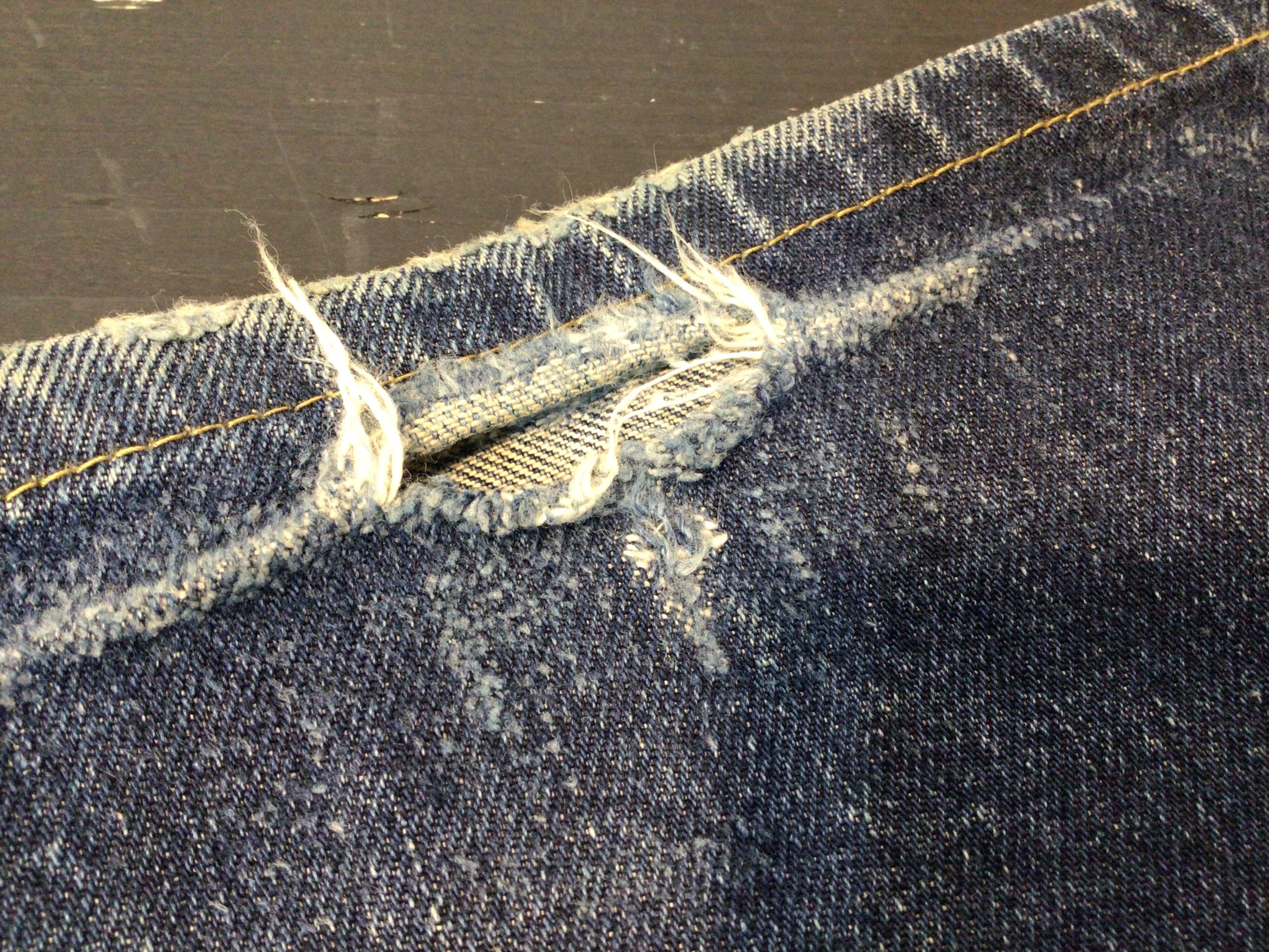 左後ろポケット周辺、股下部分、裾部分に使用感のある生地のスレや破れなどあります。