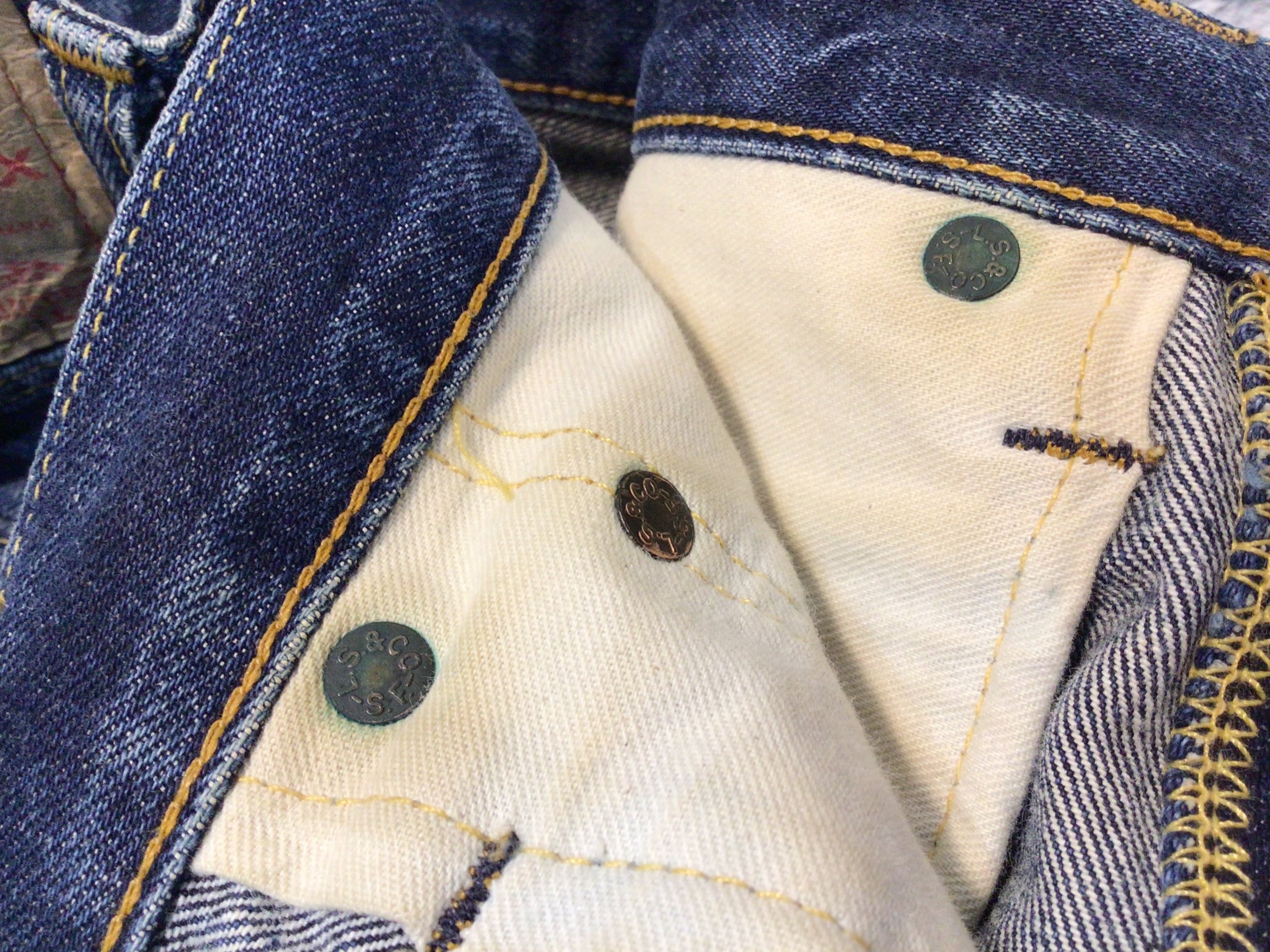 ボタン裏に緑青シミがあります。
