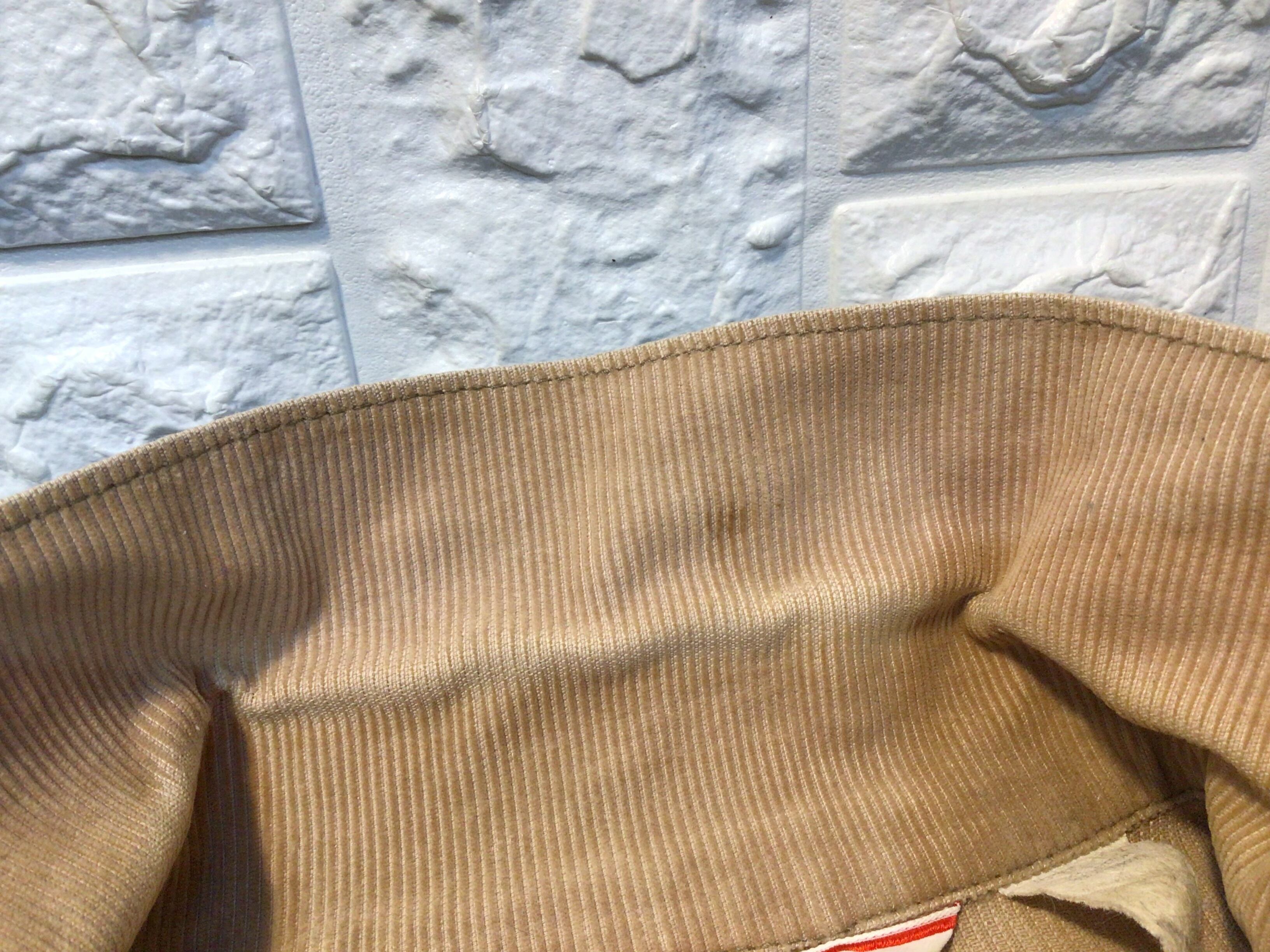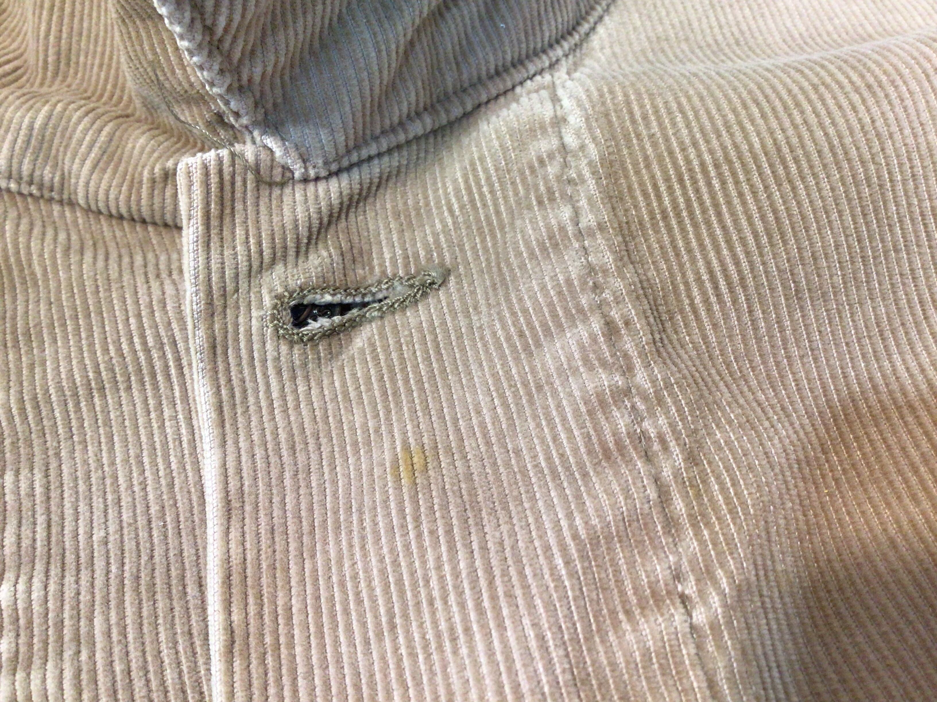 襟後ろ、正面1番ボタン下辺りに小さなシミ汚れが、胸ポケット上部に少し糸のひきつれなどありますが、経年劣化少ない状態の良い商品になっております。