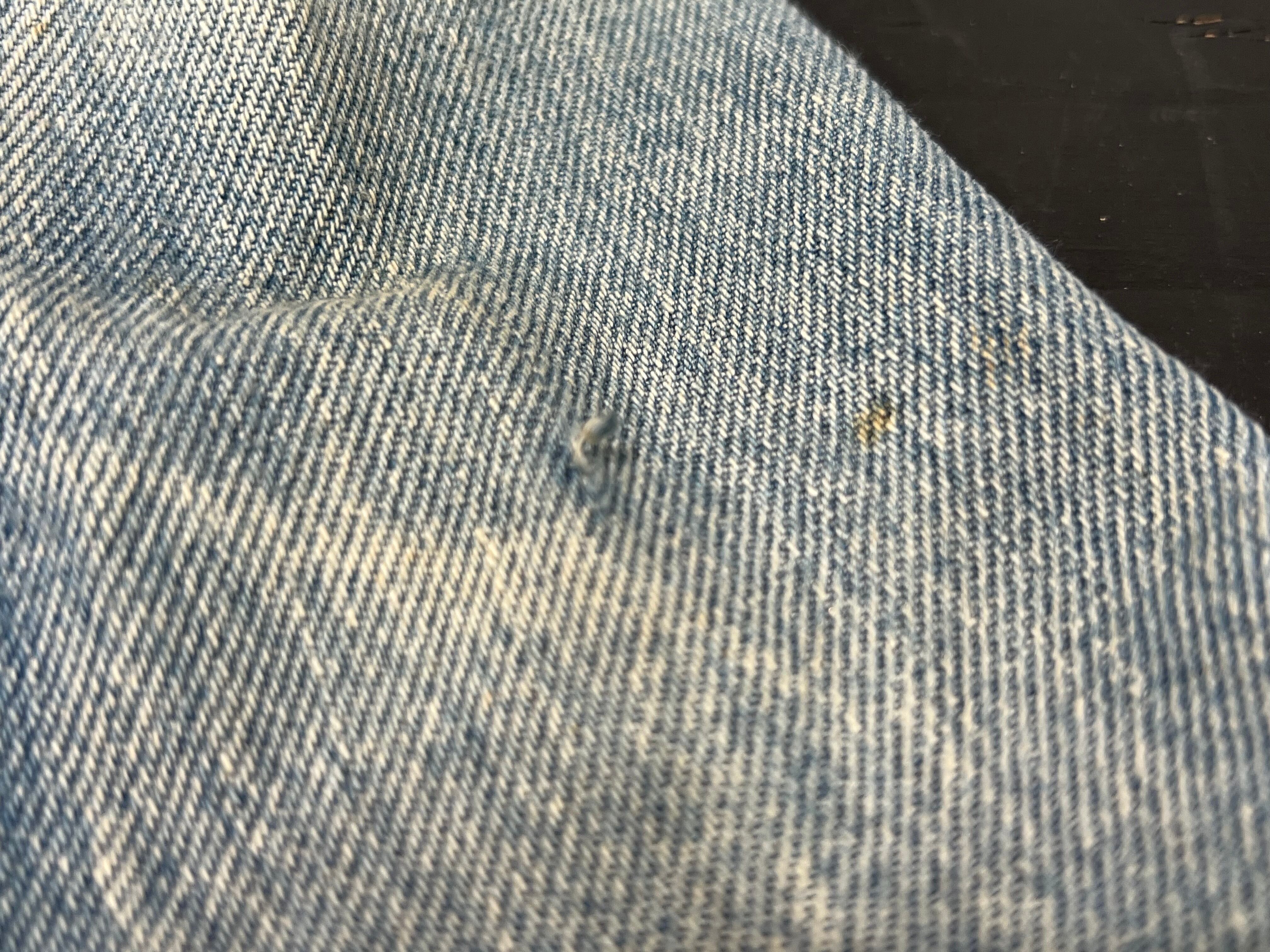 全体的に使用感のある生地のスレや汚れ、色褪せなどあります。特に両袖口の広い範囲や襟周りに汚れや色褪せなどあります。
